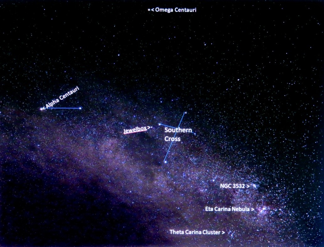 But, let us assume that sometime in the next three months you find yourself outside under a dark night moonless sky in the early to mid evening and wonder what you might look at. I suggest that you face south and locate the Southern Cross. If you are not certain please refer to the photograph that will act as the guide.
