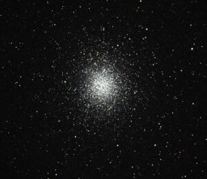 Well above the Cross in the image, you can find Omega Centauri as you sweep up your binoculars. This will appear as an unresolved blob, brighter at the centre. In a telescope this is resolved into many thousands of gravitationally bound stars. Objects of this type are called Globular Clusters, but Omega Centauri is of a huge size and may be the core of a dwarf galaxy that was captured and torn apart by the Milky Way. It is a considerable distance away – around 17,000 light years. (The final image shows an image of Omega Centauri taken with a 15cm aperture telescope. This size of telescope is in common use by amateur astronomers and the image approximates what you might expect to see in such a telescope under dark sky conditions. Of course the larger the telescope, the more light that is gathered – as well as increased resolution for seeing finer detail.)